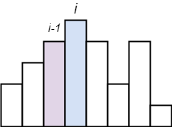 假設與之前一樣,由直方圖最左邊柱子掃描到最右邊的柱子,先考慮到兩種 Case,第一種是 i 柱子比 i-1 柱子還要高,那表示 i-1 柱子還可以繼續延展向右邊其矩形面積,且 i 柱子也可以開始計算其矩形面積,i 柱子為其矩形最右側的柱子: